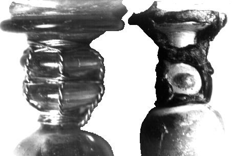 The illustrations below show two different types of period repairs; that on the left using gold-covered wire, whilst that on the right uses a metal collar, thought to be lead. These were found in Bagshot in an excavation of an early 17th century inn by the Surrey Heath Archaeological and Heritage Trust. The first type of repair appears unique, but examples of the latter type have been found in London and Oxford. They appear to use similar techniques, but whether they are the work of one travelling craftsman or represent a common side-line for glasiers is uncertain. That it was worth repairing these glasses at all emphasises their value. It also shows a change between the way glass was valued in the late 16th century; it was a sign of wealth that you could afford to use - and break - these precious items; to valuing them for their utility.